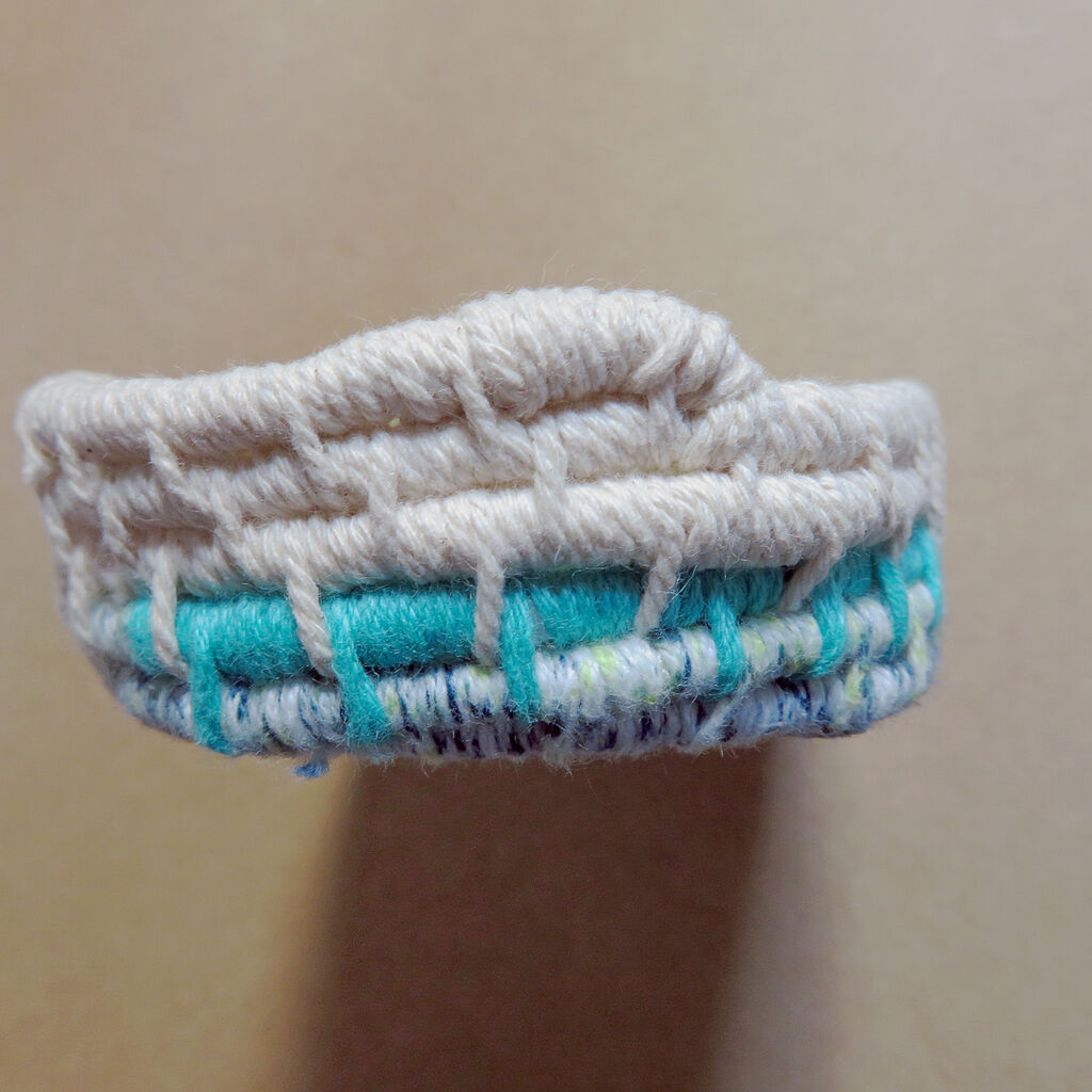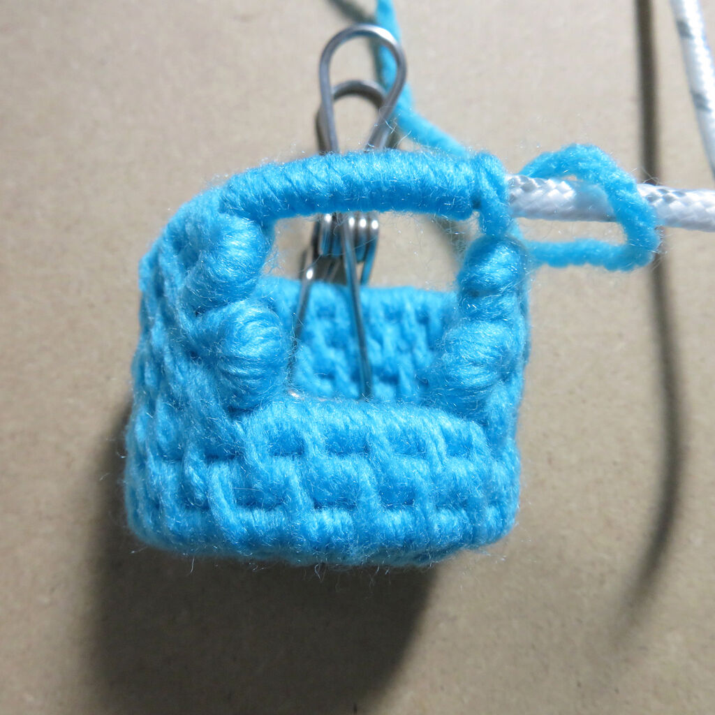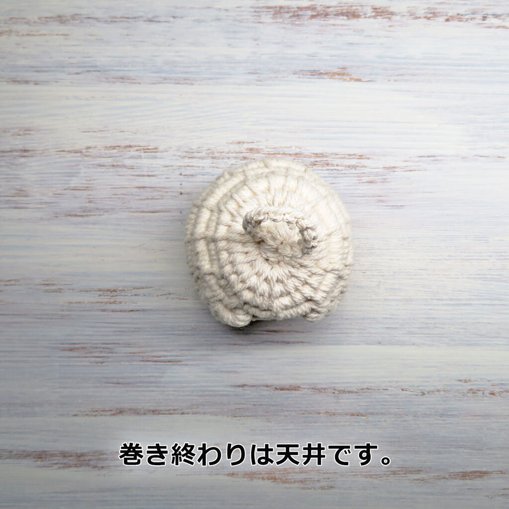 底はコットンの編み糸、側面はタコ糸で途中で一部