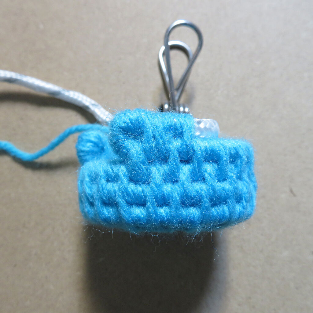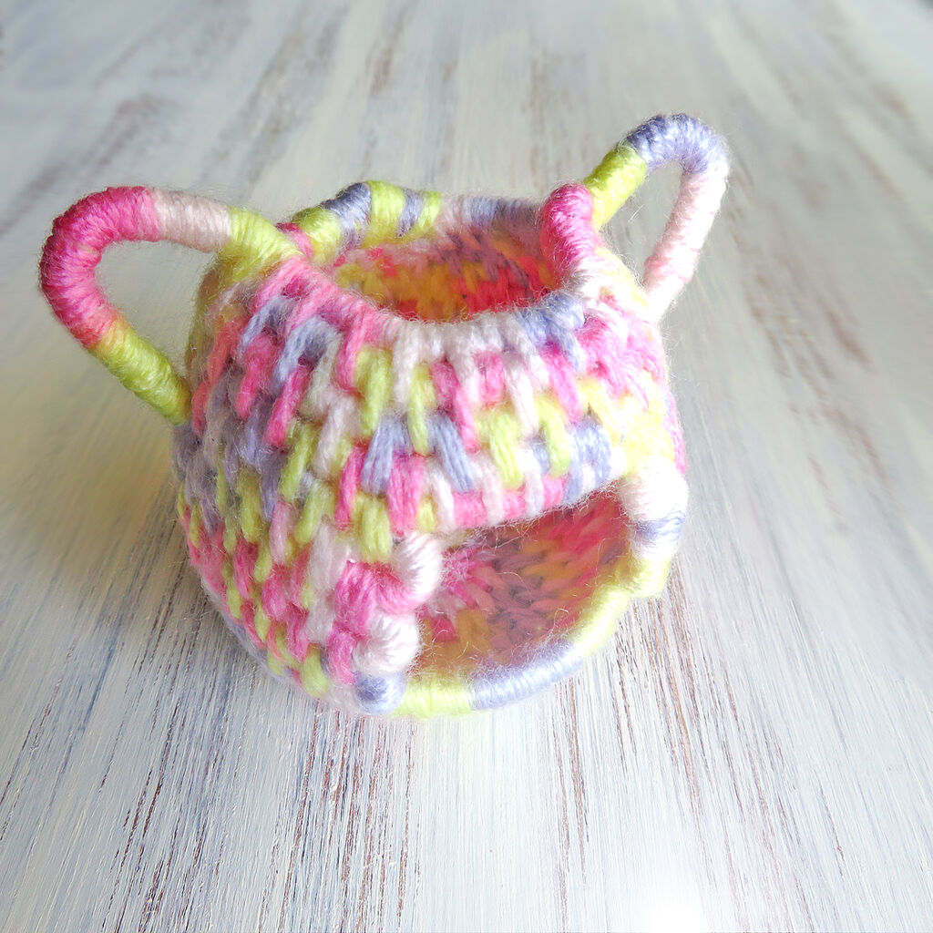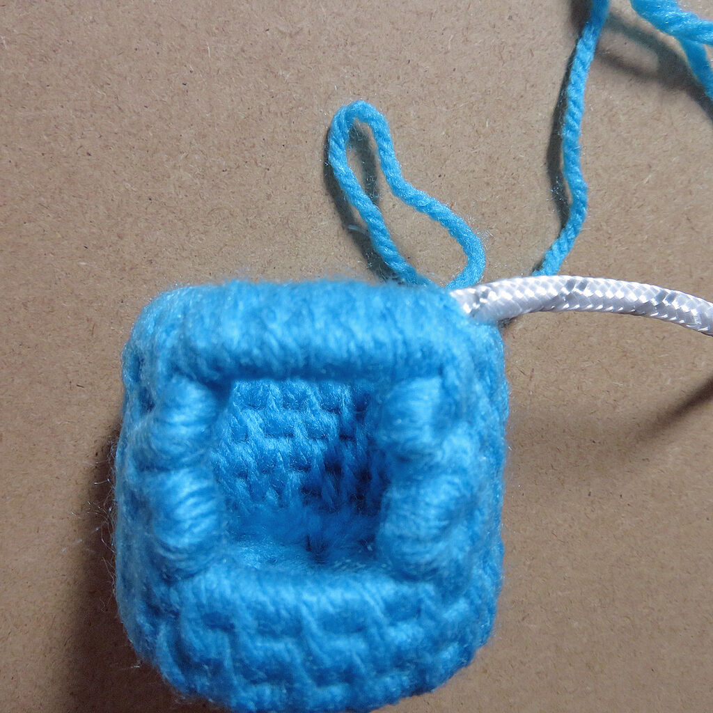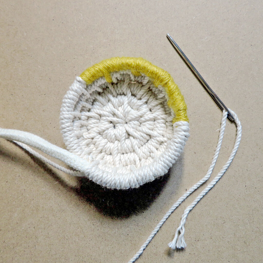 底はコットンの編み糸、側面はタコ糸で途中で一部
