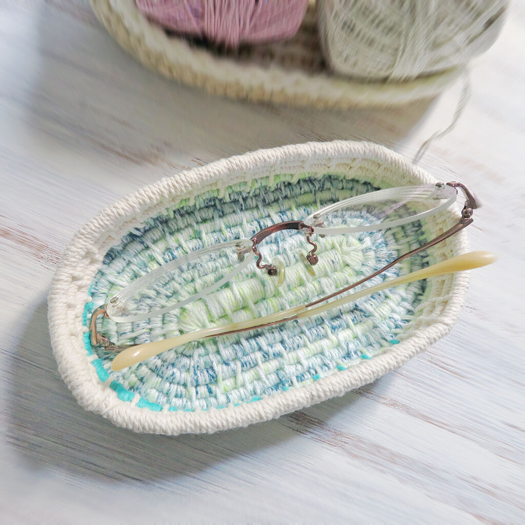 芯に別の糸を編み針で編み付けていったりといろいろな方法で作るカゴやトレイです。