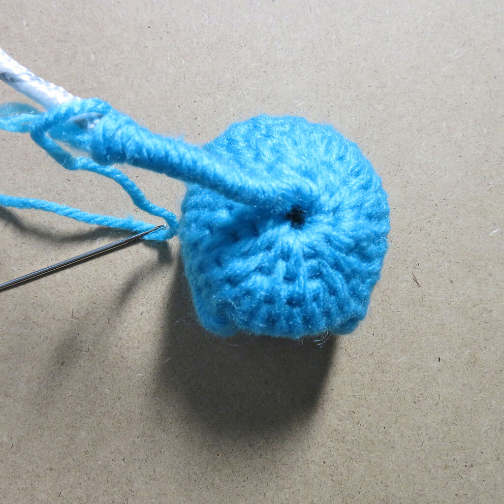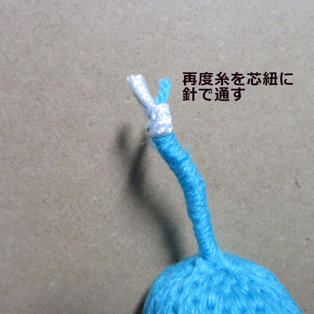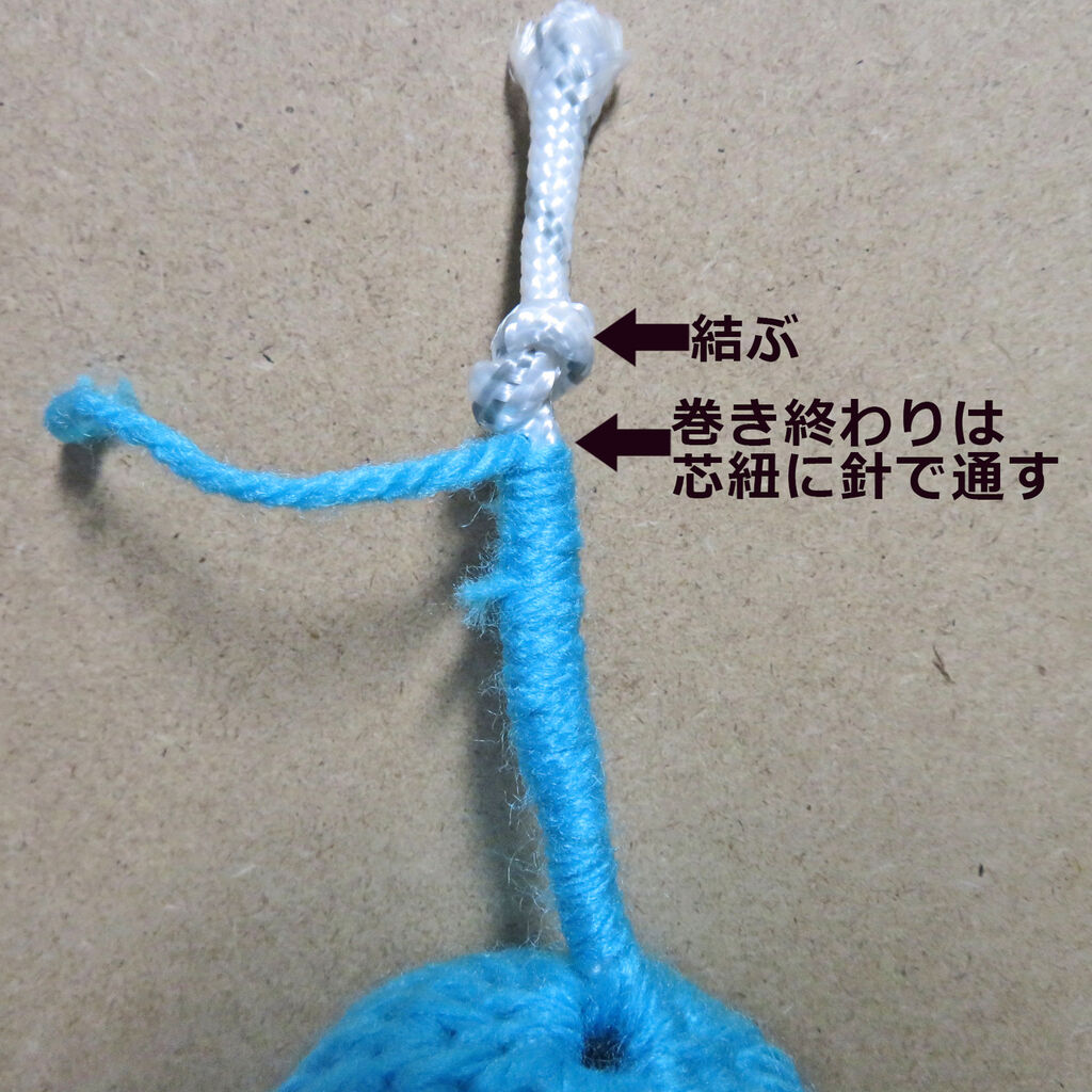 芯の結び目に針で毛糸を通し毛糸と芯を短く切る