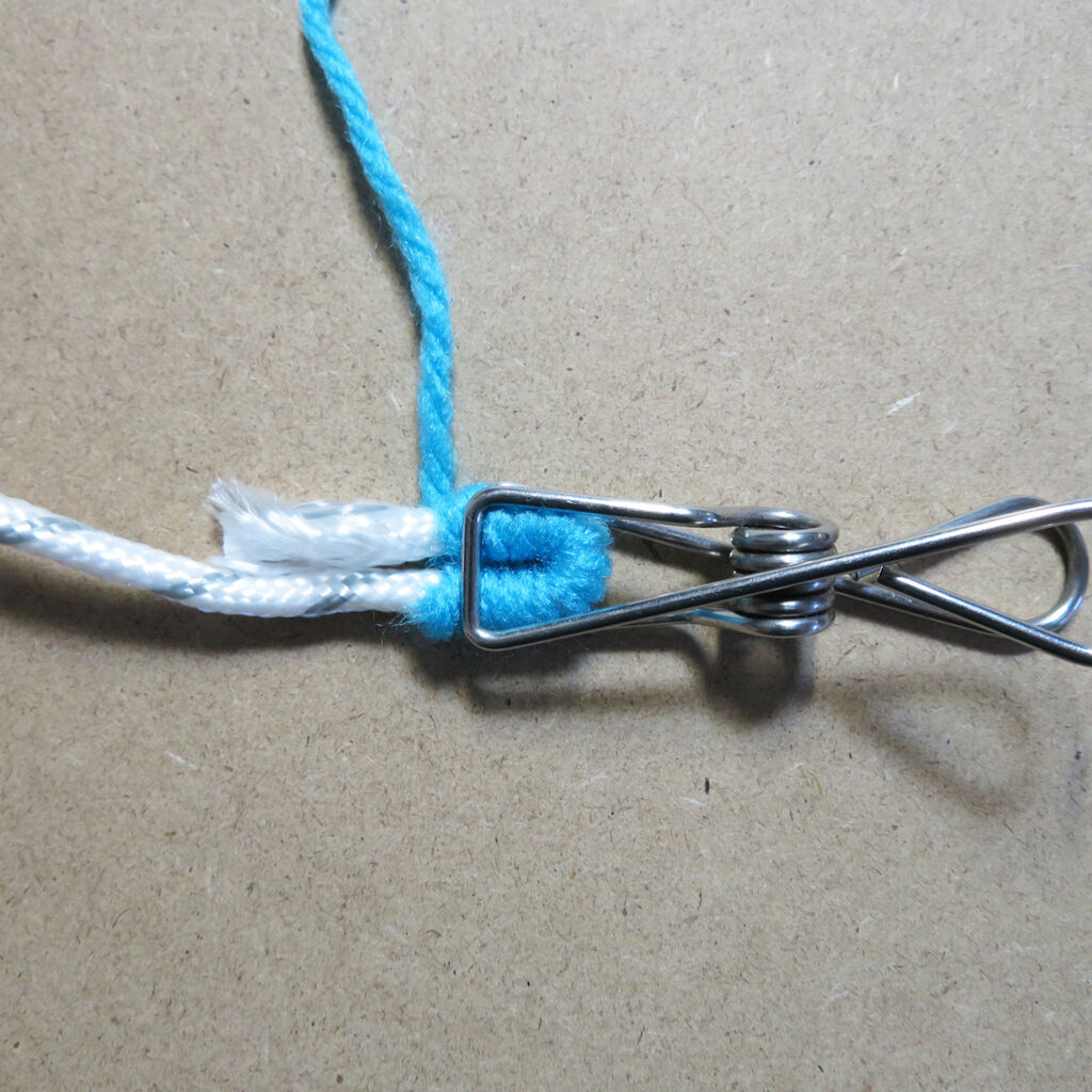 芯のロープの端から1センチくらいのところから毛糸を巻く。