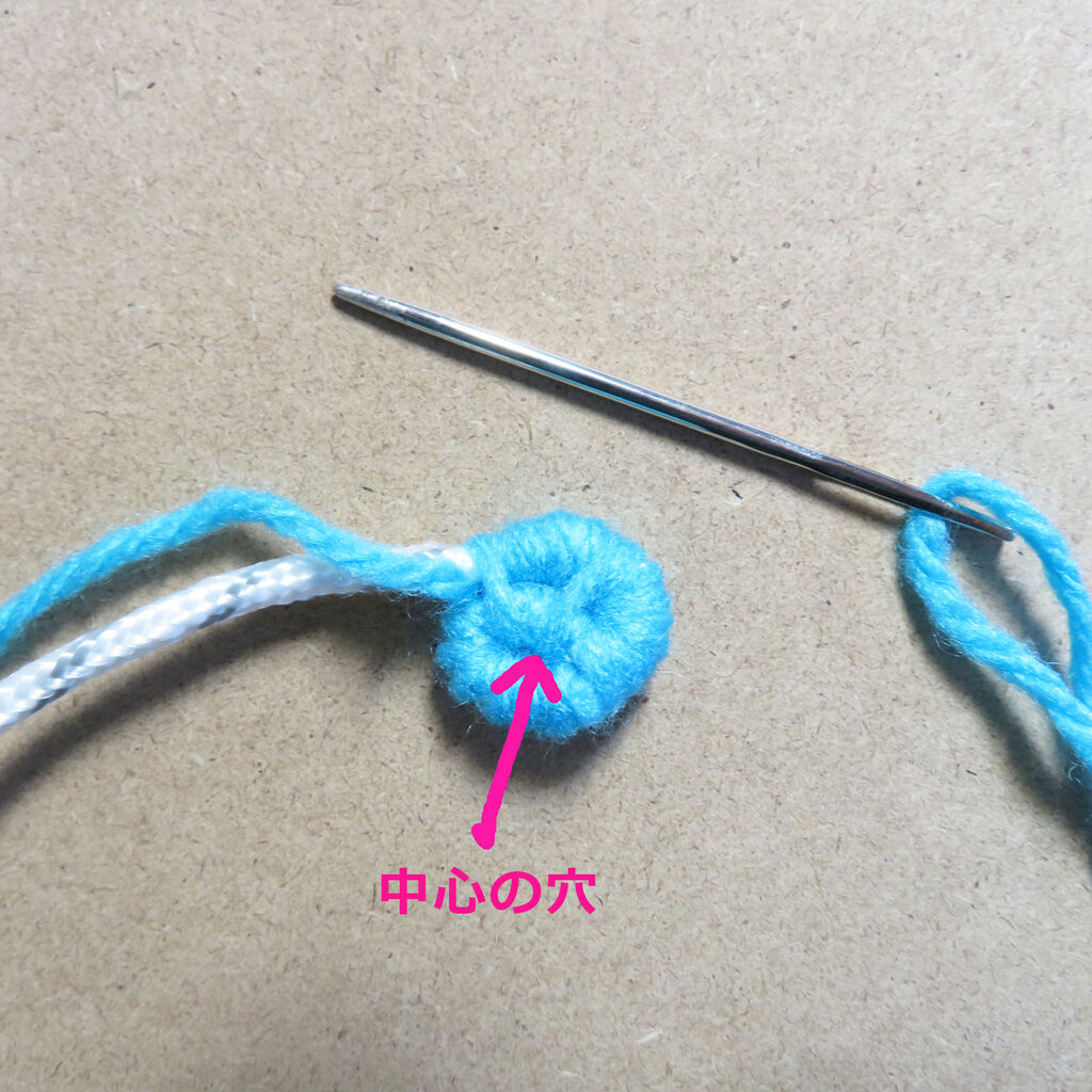丸く曲げて針で中心の輪の穴から手前に毛糸を通す